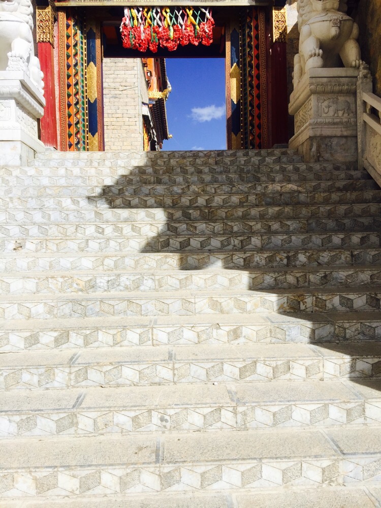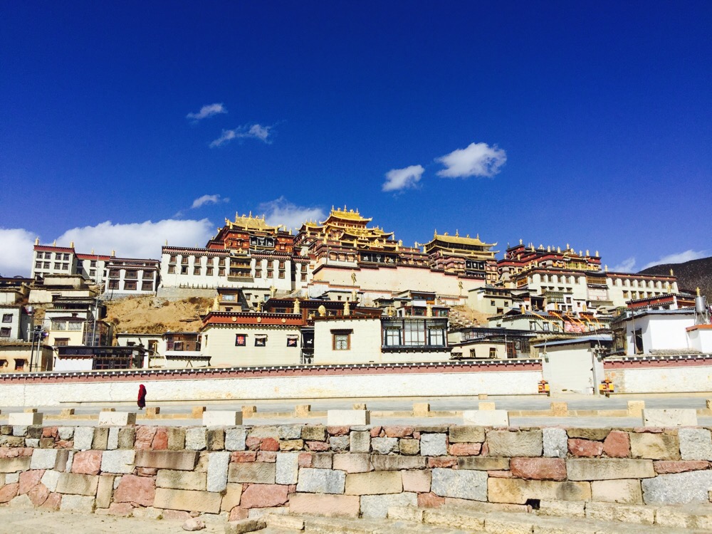 噶丹·松赞林寺。前两天一直下雪,今天的天空格外晴朗。寺院门口是圣女寄魂湖——拉姆央措湖。松赞林寺是云南境内最大的藏传佛教寺院。虽说是藏传佛教寺院,其实里面集中了各个地区和民族的“教派办事处”。也记不住那些教派和每种教派的老大是谁,不如找个地方坐着晒太阳。