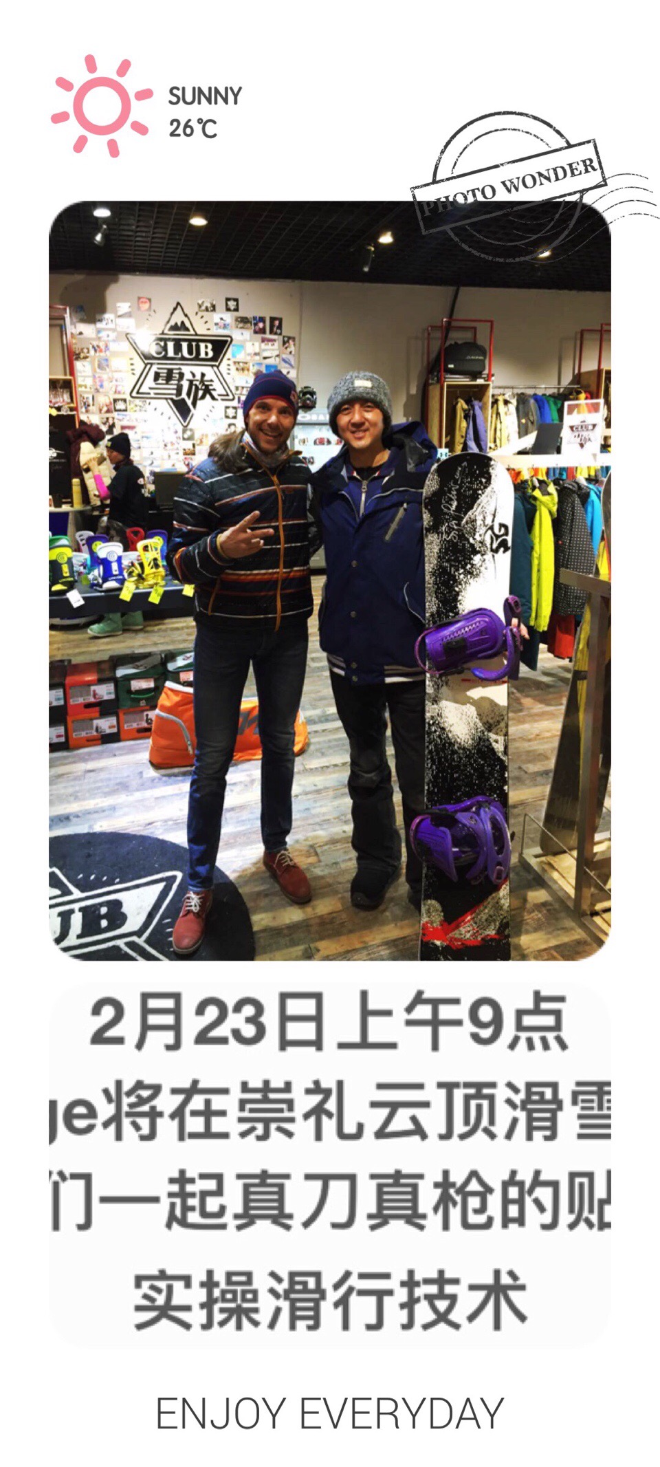 SG的雪板每一款都会征服一座雪山,把那座雪山的风景和定位拍下来印在雪板上。Sigi G这次特地来崇礼雪族俱乐部宣传以他的名字命名品牌的雪板,付良前阵子刚好买了其中一款,这次获得了Sigi G的签名。冬奥会为崇礼带来了活力,也带动了整个小镇的经济。据说以前打高尔夫的现在都正在奔往单板滑雪的路上。