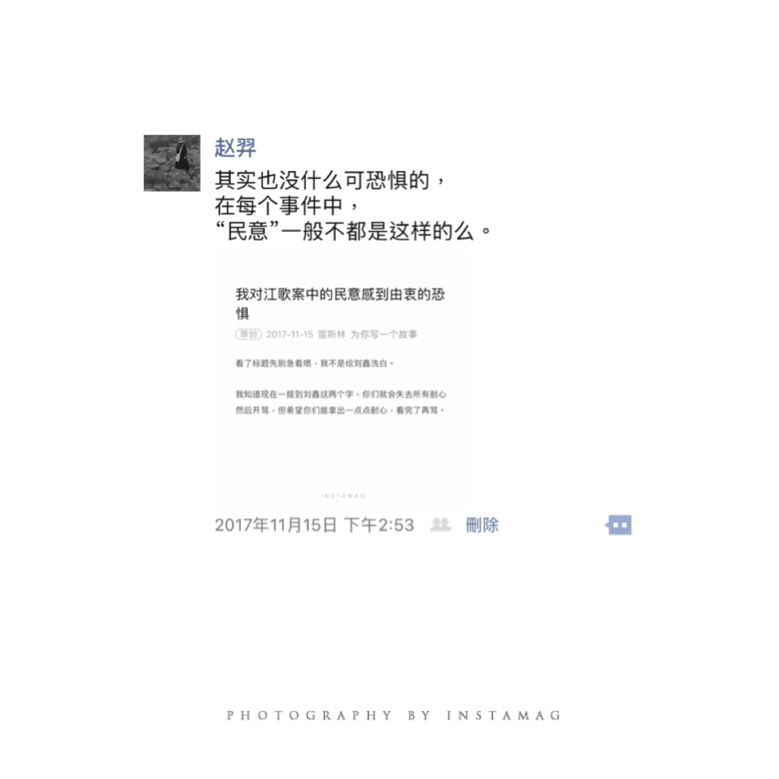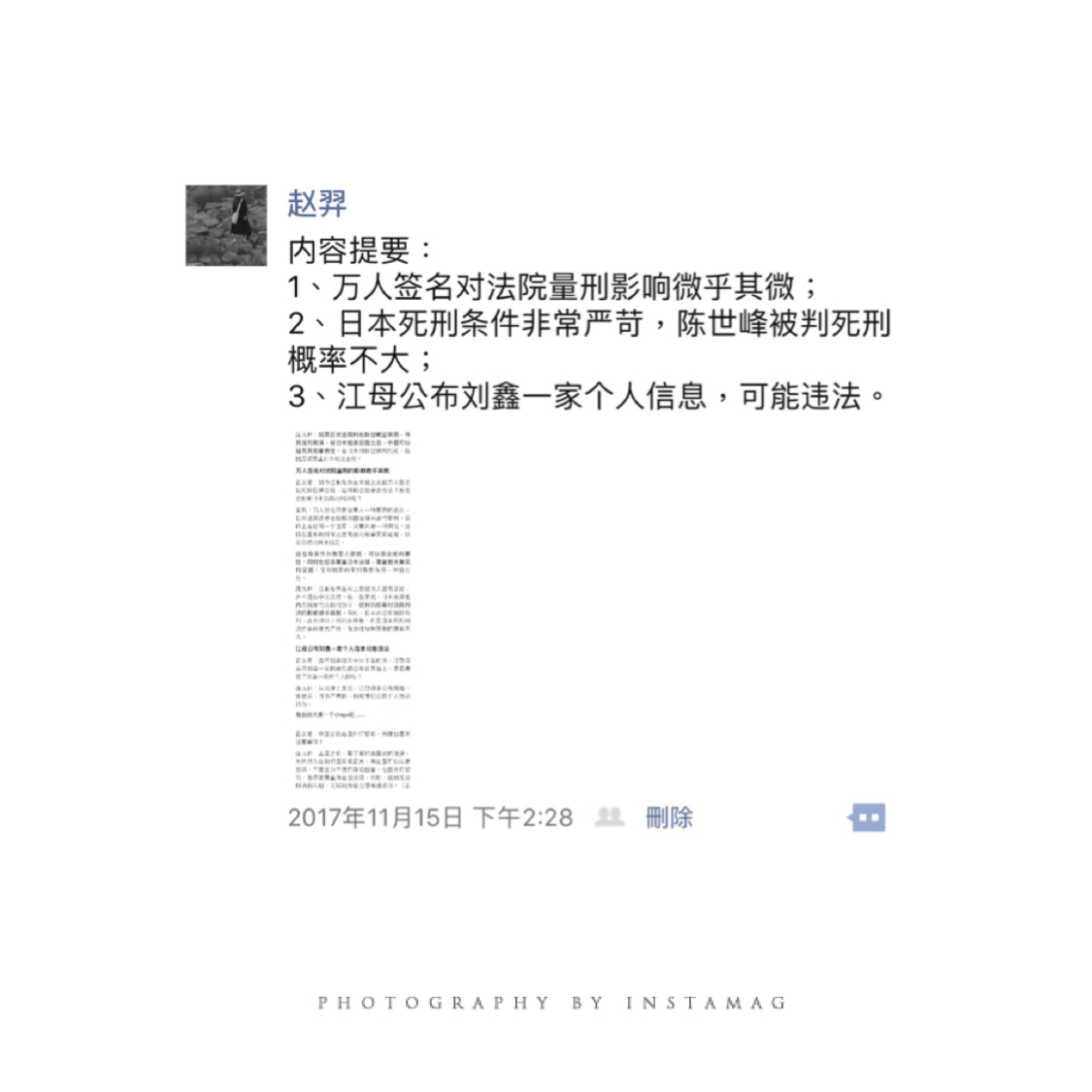 只怪自己某天随手点开一个首页头条视频,不小心知道了这件事。虽然从开始的悲剧转化为目前混乱的闹剧,但实际大的框架和原则并没有如图所示的任何改变。即使是蓄意杀人,陈大概也是判15-20年。有人会拿当年的药家鑫判死刑来做对比,记得那个案子就是由于舆论压力太大,在仓促之中给药家鑫判重了,否则应该是无期或几十年,这在后来也有专业人士和媒体人做过分析,大家对药家鑫都表达了惋惜之情,对舆论的混乱表达了无奈。。对于刘鑫的认知,算是每个人对“朋友”这个概念自我理解的投射,没有标准答案,但是只要法律没有追究她责任,她就是相对清白的,任何人都没有资格去指责通过网络碎片化信息而认识的那个人。。今天跟付良说,如果我遇害了,不论什么原因,简单走法律程序,你麻溜把我处理掉,千万别声张,更不必公开悼念,我嫌吵,也丢不起那人。。愿逝者安息,生者坚强,众者好自为之。。愿我以后慎入视频、网页,少掺合闲事。🌙✨