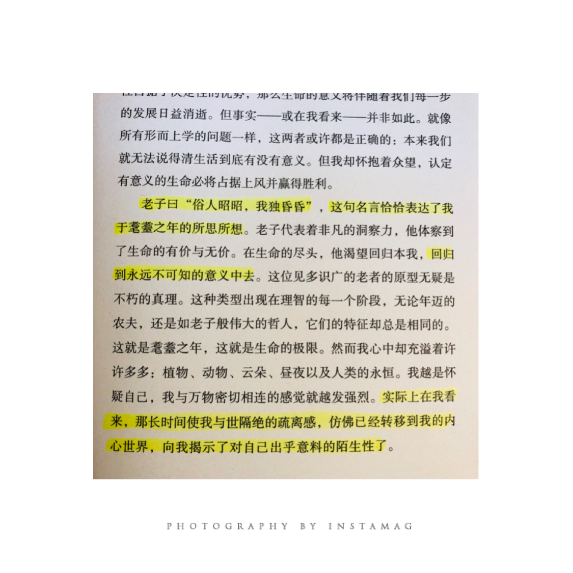 用一周时间另外读完《荣格自传》,结尾处,他果然以老子思想结束了全篇。荣格终其一生对自己和他人的心灵及潜意识做形而上的精细探求,在耄耋之年,却借由老子思想感悟并接受那个“不可知的陌生的自我”,这不是荒谬,刚好是真实。。《道德经》以一种令人费解不合逻辑的风格写成,充满了迷人的矛盾,他所表达的人生观、世界观几乎是粉碎性的绝决,原因是他的人生观和世界观都是从宇宙观来的。这个角度刚好拯救了荣格一贯的方向和视角,最终被晚年荣格所接受。
