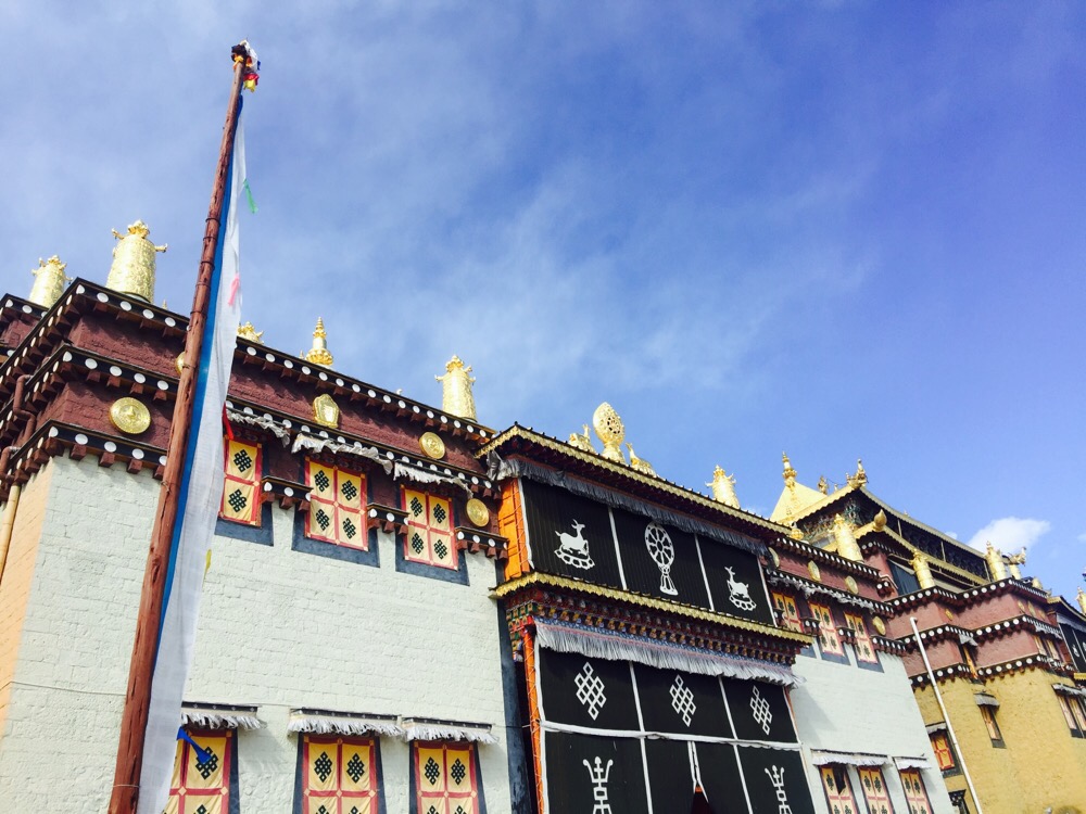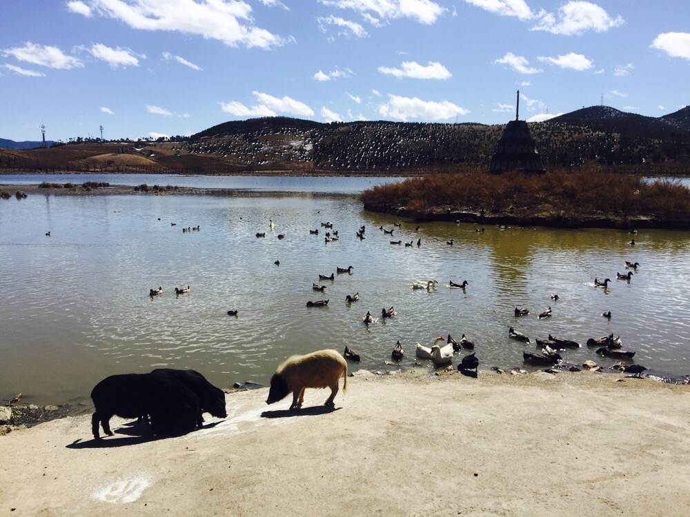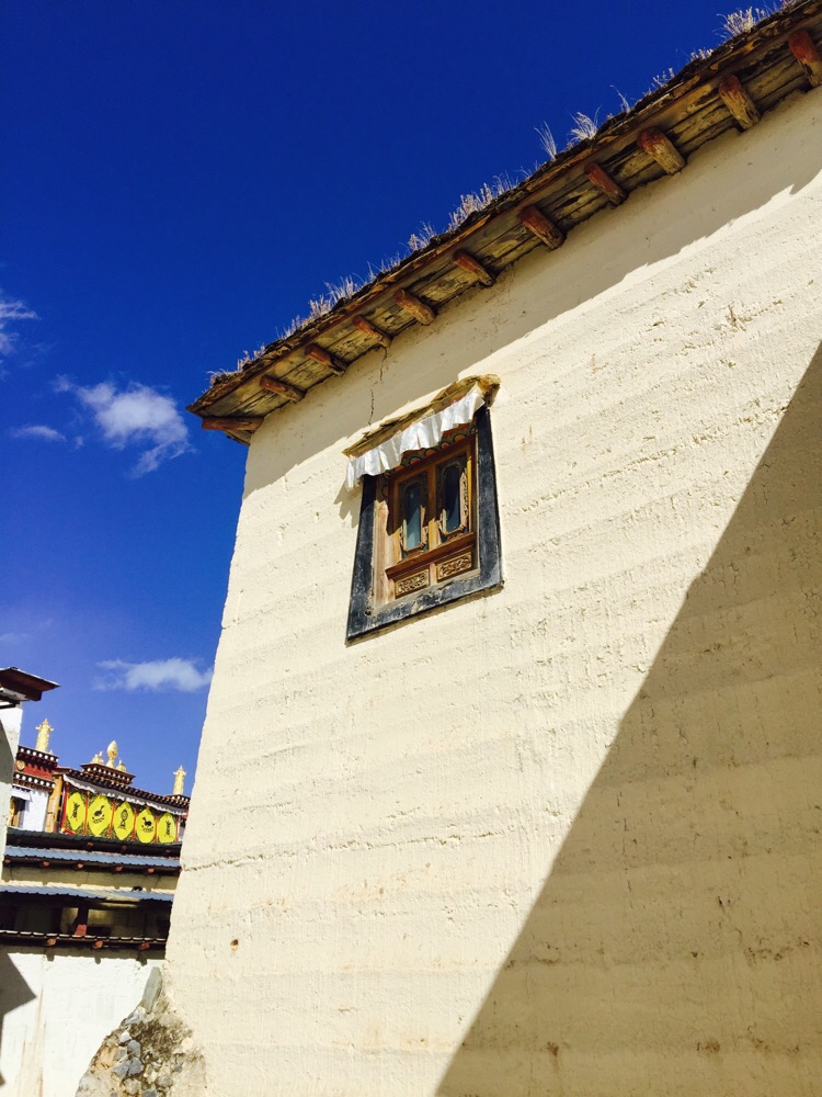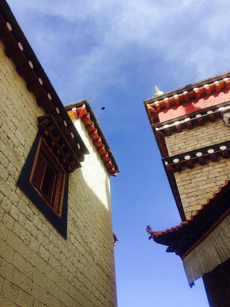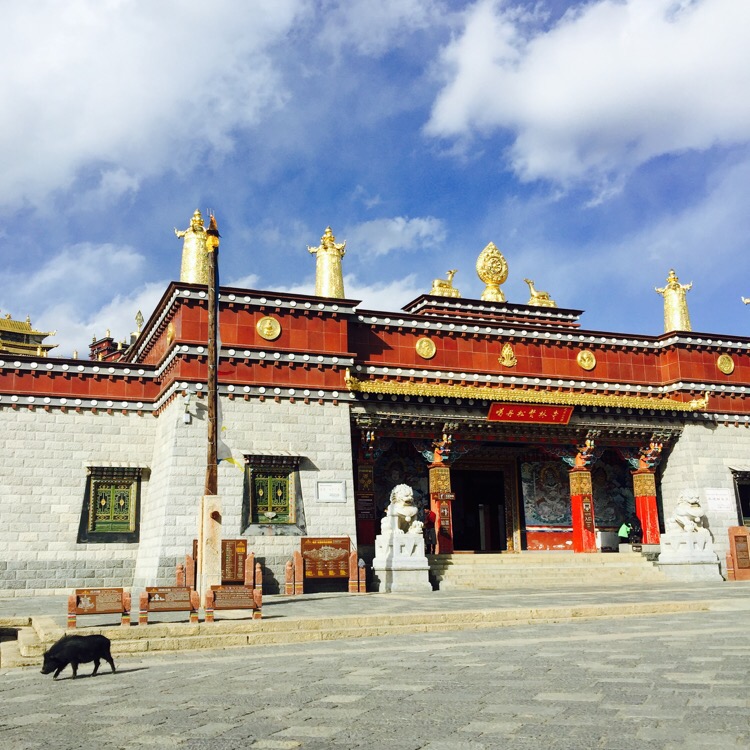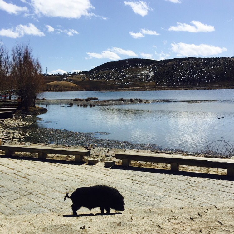 噶丹·松赞林寺。前两天一直下雪,今天的天空格外晴朗。寺院门口是圣女寄魂湖——拉姆央措湖。松赞林寺是云南境内最大的藏传佛教寺院。虽说是藏传佛教寺院,其实里面集中了各个地区和民族的“教派办事处”。也记不住那些教派和每种教派的老大是谁,不如找个地方坐着晒太阳。