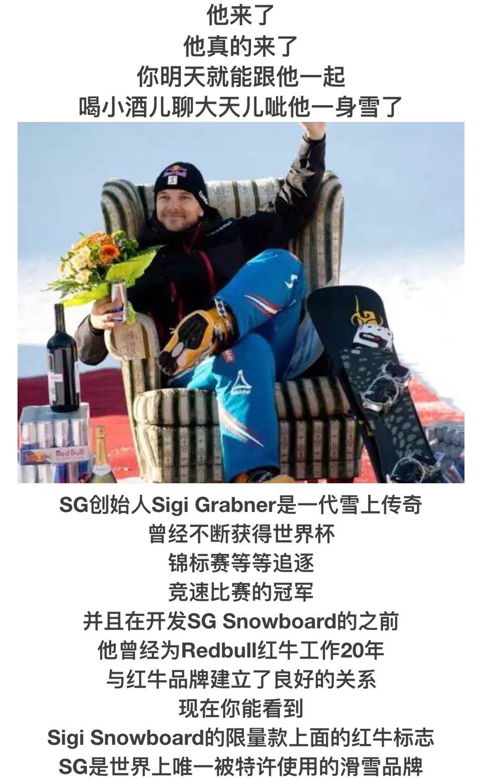SG的雪板每一款都会征服一座雪山,把那座雪山的风景和定位拍下来印在雪板上。Sigi G这次特地来崇礼雪族俱乐部宣传以他的名字命名品牌的雪板,付良前阵子刚好买了其中一款,这次获得了Sigi G的签名。冬奥会为崇礼带来了活力,也带动了整个小镇的经济。据说以前打高尔夫的现在都正在奔往单板滑雪的路上。